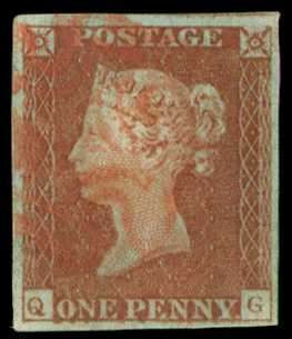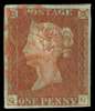 Plate 15. Very fine used good to large four margin example lettered QG, showing basal shift variety. Beautifully cancelled by a red MC. Very scarce so fine. Spec. BS4sb. 1989 RPS Cert.