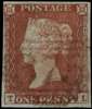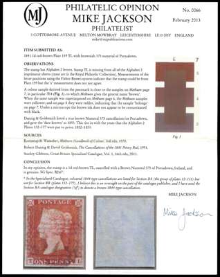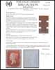 1841 1d red-brown Plate 159 (TL), on blued paper, four close to good margins, struck by 375 numeral for Portadown Ireland in brown, fine and scarce. Mike Jackson Opinion (2013) SG 8, Spec. B2xf
