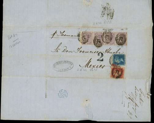 Postal History: 1860 (1 May) entire letter marked ‘pr Tasmanian’ addressed to Mexico franked with 1856-58 1d, 1858-76 2d, plate 8, and 1855-57 6d, strip of four, all tied by ‘21’ in oval of bars numeral cancels, obverse with ‘2’ instructional mark, the reverse with London thimble cds in blue and indistinct arrival mark; horizontal filing fold affecting 2d. A most appealing franking to an unusual destination