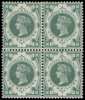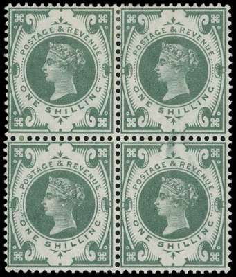 1887 1s dull green. Very fine and fresh unused o.g. block of four. A very attractive and scarce multiple. Ex "Verus".