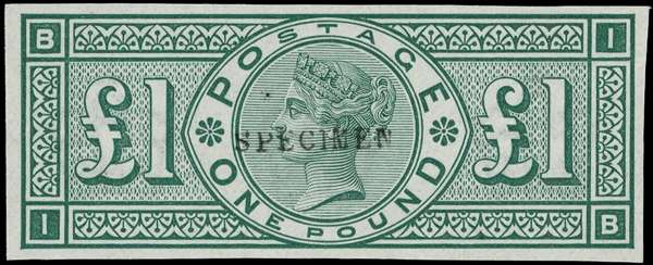 1890 £1 green, imperforate example optd ‘SPECIEMEN’ type 9, brilliant o.g. taken from the first sheet printed in the new colour and sent to H.C. Rakes, the Postmaster General for approval in November 1890, very fine. SG 212var; Spec.K17s