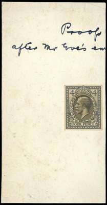 1912 4d Bromide of Eve‘s Wreath design (22mm), with background shading horizontal, cut to stamp size and mounted on thin card, annotated at top “Proof after Mr Eve‘s em(endations)“. Scarce. See Specialised Vol.2 catalogue pg.120. SG 378var