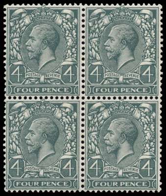 1913 4d Grey green (Wmk. Royal Cypher doubled, one Inverted & Reversed). Very fine unused o.g. block of four showing Double watermark variety, upright and a second watermark inverted & reversed. An amazing watermark variety presently unlisted but to be recorded in the next Specialised Vol.2 Catalogue as Spec. N23(1)da.