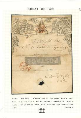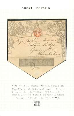 1840 Mulready 1d May date selection (3) comprising 7th envelope (Forme 2, Stereo A144) to London cancelled by very neat red Torrington Maltese Cross, 8th wrapper (Forme 2, Stereo A19) addressed locally in London with ‘KING STREET/COVENT GARDEN’ straight-line hs in black and red Maltese Cross and 9th envelope (Forme 2, Stereo A154) to Lymington cancelled by Brighton vermilion Maltese Cross; all have some faults nevertheless a scarce group. ME1, 2