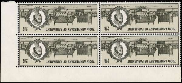 1965 2s6d 700th Anniversary of Parliament (Wmk. Inverted). Very fine unmounted o.g. corner marginal block of four.