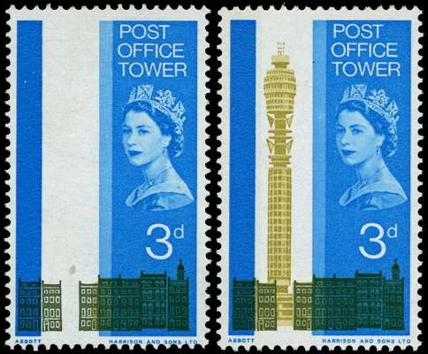 1965 3d Opening of Post Office Tower, olive-yellow (Tower) omitted, offered with normal for comparison, scarce and fine unmounted o.g. SG 679a