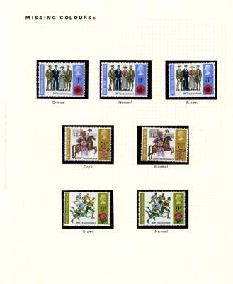 1971 Anniversaries (4th series) 3p red-orange nurse's cloak omitted, 3p olive-brown (faces etc) omitted, 3p blue shift, 7½p grey omitted, 9p olive-brown omitted, 9p olive brown shift, offered with normal stamps for comparison, a nice group, fine unmounted o.g. SG 887b, 887c, 887var, 888a, 889a, 889var