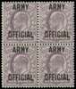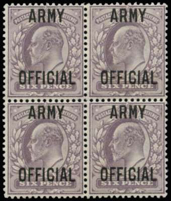 1903 6d Dull purple (Army Official, Ovpt type O6). Superb unused o.g. block of four very lightly hinged on top pair only. A great departmental rarity with only one other block of four recorded in private hands. 1947 & 1989 RPS Certificates. Ex Sir Gawaine Baillie.