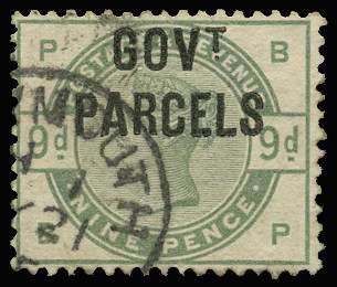1883 9d Dull green (Govt. Parcels). Very fine used example lettered BP, neatly cancelled by a small part cds. Lovely colour and scarce to find with a cds.