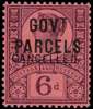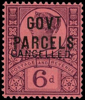 GOVERTMENT PARCELS: 1887 6d purple on rose-red, optd ‘CANCELLED’ type 14, fine o.g. vertical bend, otherwise fine and scarce. SG O66var; Spec.L27t Ex. Marcus Samuel