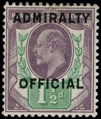 ADMIRALTY OFFICIAL: 1904 1½d dull purple and green, type O11, brilliant large part o.g. very fine example of this scarce departmental issue. RPSL Certificate (1956) SG O109 £1900 Ex. Minoru