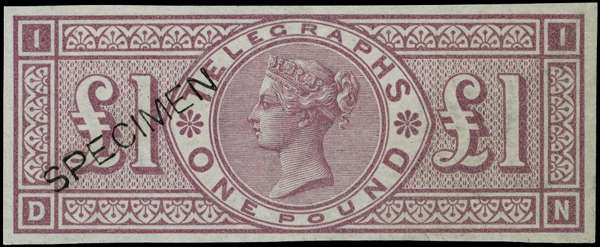 TELEGRAPH: 1877 £1 Plate 1 (DN) imperforate colour trial in dull claret, optd ‘SPECIMEN’ type 8, large part o.g. fine and scarce. SG T17var