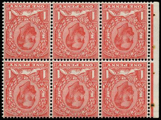 1911 1d Scarlet (Die 1b, Wmk. Royal Cypher Inverted). Very fine and fresh unmounted o.g. booklet pane of six.