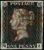 1840 1d black Plate 1b (QI), four good, struck by neat red MC, fine. SG 2