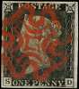 1840 1d black Plate 2 (SD), four good to large margins, struck by bold bright red MC, fine. SG 2