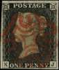 1840 1d black Plate 4 (KJ) with 4 margins and neat strike of red MC, a fine example.