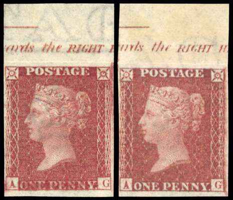 1856 1d red-brown imprimaturs, Plate 25 and 27, lettered AG. A fine matched top marginal pair, fresh. SG 29/33, Spec. C8, £1700