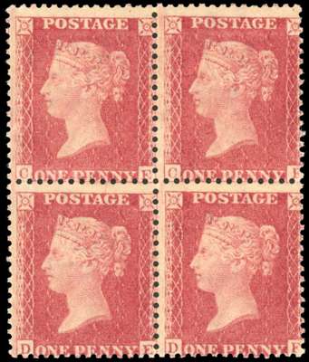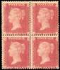 GB 1856 Large Crown 1d pale rose-pink, Plate 67 mint block of four