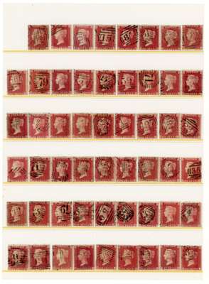 1855 1d rose-red Plate 45. Partial reconstruction (with some duplicates) of this extremely scarce plate; 153 stamps. Condition mainly good to fine with very few ugly postmarks, a remarkable accumulation. SG 40, Spec. C10, cat £45900