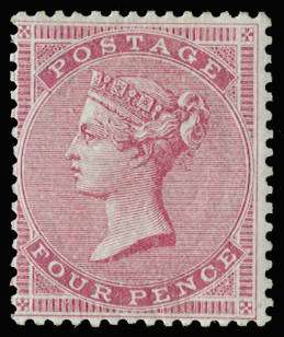 1857 4d rose-carmine on thick glazed paper. A fresh part o.g. example; excellent quality for this difficult stamp. SG 66g, £6500