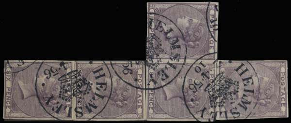 1856 6d deep mauve plate proofs. An imperforate reconstructed multiple of five (three singles and a horizontal pair), neatly cancelled by experimental Helmsley cancels with a Crown in the centre, of 2.4.56. A spectacular and important multiple. SG 69 var