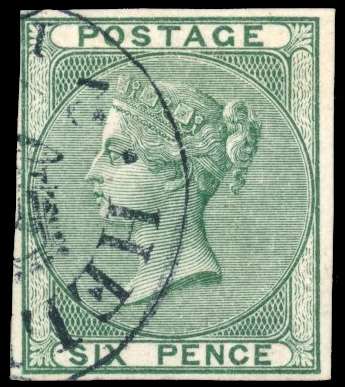 1856 6d plate proof in green on thin white card, showing Helmsley Crown experimental cds, fine and scarce. SG 69var