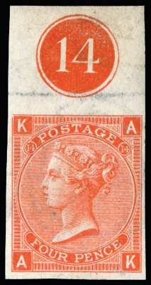 1869 4d vermilion Plate 11, watermark Large Garter, lettered AK. O.g. imperforate imprimatur example with upper margin showing the Plate number, fine and unique in private hands and with excellent provenance. SG 94.