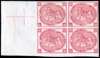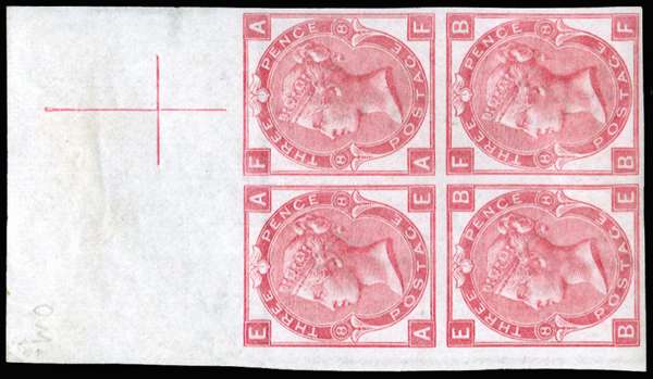 1872 3d imperforate colour trial in deep rose Plate 8, top marginal block of four lettered AE-BF. The upper pair unmounted, the lower pair rather extensively hinged, still fine and notably rare in a multiple. BPA Certificate (2009). For SG 103, £10000