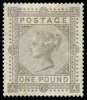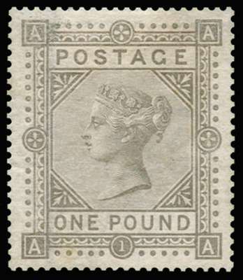 1878 £1 colour trial in greyish drab, watermark Maltese Cross, perf 14 (issued stamps perf 15½ x 15), lettered AA. Believed to be the unique colour trial of the £1 in private hands, the others all in either the Royal Philatelic Collection or the R.M. Phillips Collection in the British Postal Museum Archive. Hints of toning on the gum. For SG 129