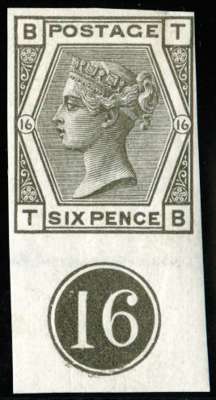 1878 6d grey, Plate 16. Lower marginal imperforate imprimatur lettered TB, showing the Plate number, unused with traces of gum. Unique in private hands, with impeccable provenance; ex Crawford, Bates, Beaumont and Latto. SG 147