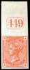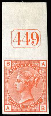 1876 4d vermilion, Plate 16. The abnormal imperforate imprimatur, top marginal with Current number 449. O.g., hinged on the selvedge only. Strong colour and fresh, a remarkable rarity. Unique in private hands. SG 152 var, £15000+