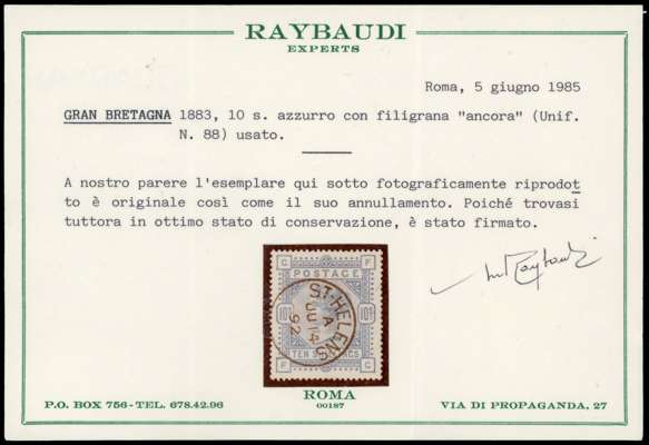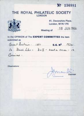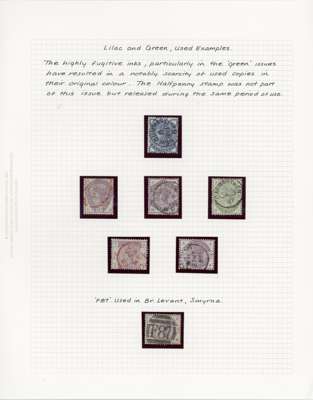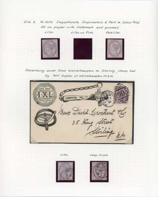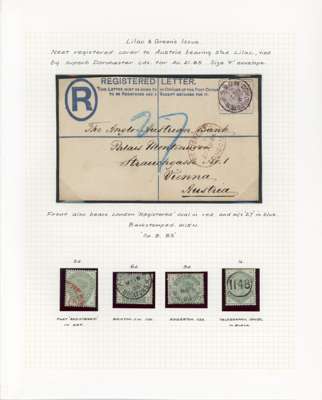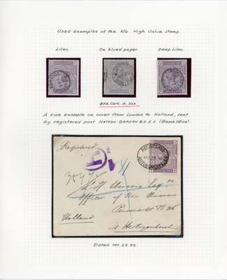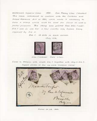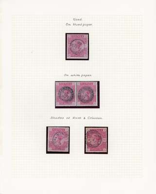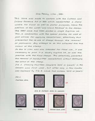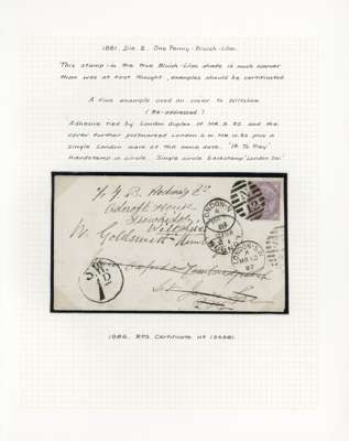1880-83 collection, well written up on leaves. Includes 1d lilac 14 dots mint, both shades, the pale lilac unmounted, bluish lilac on cover (RPS Certificate 1986), and 16 dots printed both sides mint, also two imperforate imprimaturs. High values with 2s6d on blued used (copy of 1984 BPA Certificate when in a pair), one short perf, 5s on blued paper, very pretty used (1960 BPA Certificate mentioning ‘slightly creased’ across top); white paper 2s6d on neat cover, the stamp with damaged upper left corner, and a CDS 10s with Raybaudi 1985 Certificate. 1883 series includes three Hoster covers (one creased) and three illustrated envelopes. Better used throughout, an excellent collection without any dross, ex Cyriax