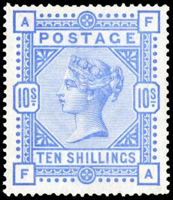 1883-4 10s ultramarine on white paper. A good mint example, lightly hinged, a few gum bends; very fresh. Ex Cyriax. SG 183, £2250