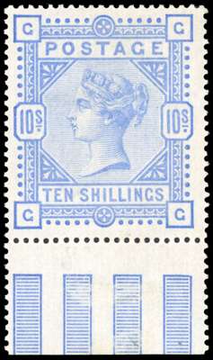 1883-4 10s pale ultramarine, lower marginal. A fresh mint example, with rather awkward central hinge and with a few wrinkles otherwise fine. Ex Cyriax. SG 183a, £2500