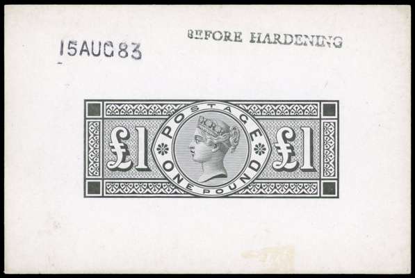 1883 £1 brown-lilac Die Proof with uncleared corner squares on white glazed card 92 x 62mm, endorsed BEFORE HARDENING and dated 15 AUG 83. Very fine and fresh, save for a light hinge trace on the front at the base. For SG 185, £4250