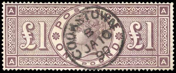 1884 £1 brown-lilac, watermark Crowns. A very fine used example lettered ‘AA’, Cookstown CDS JA 10 90. Strong colour. Ex Cyriax. SG 184, £3000