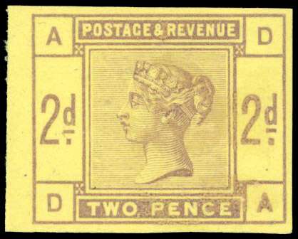 1883 imperforate colour trial for the 2d value, on gummed paper without watermark. Printed in lilac on yellow paper, fine and very lightly hinged. Ex Cyriax. For SG 189