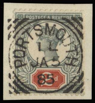 1886 Jubilee 2d green and carmine with unadopted solid value tablet trial, tied to small piece by a Portsmouth squared circle trial cancel of JA 5 85. Very rare, one of two known with this cancel. Lovely quality. For SG 200