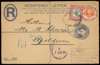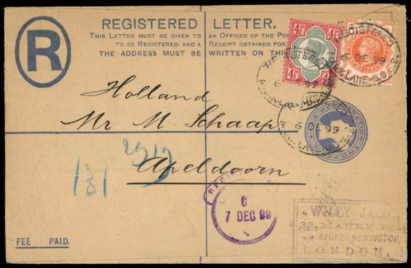 1900 (April 28) 4½d on registered printed cover to USA tied London EC cds and 1899 (6 Dec) size G registered stationery envelope to Holland, with additional 1887 ½d and 4½d tied by registered oval date stamp, SG 197, 206a. Fine (2)