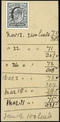 1902-10 ½d die proof from the DLR striking book printed in black on white glazed card, affixed to a large piece (53 x 110mm) endorsed with dates and number of leads. A spectacular exhibition piece. SG 215 var.