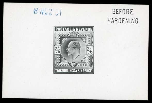 1902-10 KEVII 2s6d die proof in black on glazed card (92x60mm) endorsed ‘BEFORE HARDENING’ and dated 8 NOV 01 in blue, very fine and rare. SG 260var