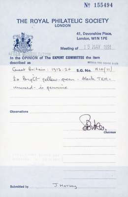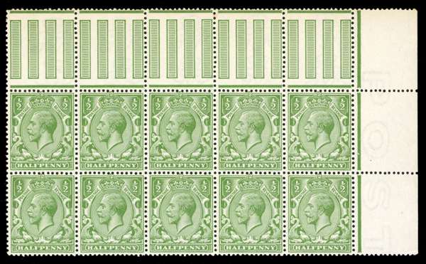 1912-24 ½d bright yellow-green, mint unmounted block of ten from the right of the sheet. Fine. RPS Certificate (1991). SG 351 var, Spec N14(11)