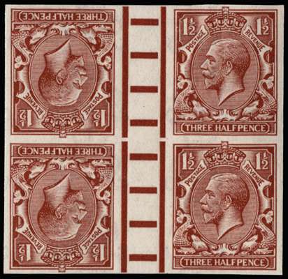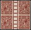 1912 1½d red-brown (watermark Royal Cypher). Superb unmounted o.g. imperforate tête-bêche gutter block of four imprimaturs showing marginal pillars with "BPMA" handstamps on reverse. Very scarce.
