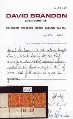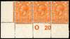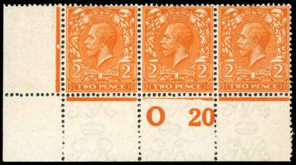 1912-24 2d intense bright orange, mint lower marginal horizontal strip of three with ‘O20’ control, fine unmounted og. Brandon Certificate (2005). SG Spec N19(9)
