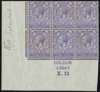 1913 3d violet lower left corner block of six with printed COLOUR ESSAY x.13 at base and pencilled ‘Not Selected’ on left selvedge. O.g., a little reinforced, some staining and toning. Unique, an important piece. SG 375 var