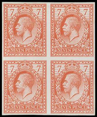 1913 7d Eve's Wreath colour essay. A fine ungummed imperforate block of four in Tyrian red, on white unwatermarked thin glazed card. Rare. SG 387 var, cat £7750