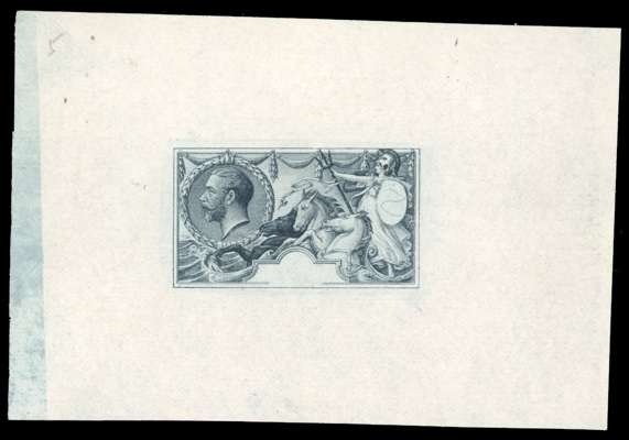 1912 Seahorse master die proof, stage 6a, in indigo-black on esparto paper (94x64mm) with pale colouring around the frame and pencil ‘5’ at upper left. A fine example of this very scarce proof. Spec. Vol 2 Pg. 197, £50,000.