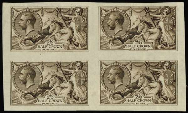 1913 Waterlow 2s6d Seahorse colour trial in sepia. Imperforate block of four, on thin ungummed “JAS WRIGLEY LD-299” paper, with light creasing as often on this paper. A striking and rare multiple. For SG 399