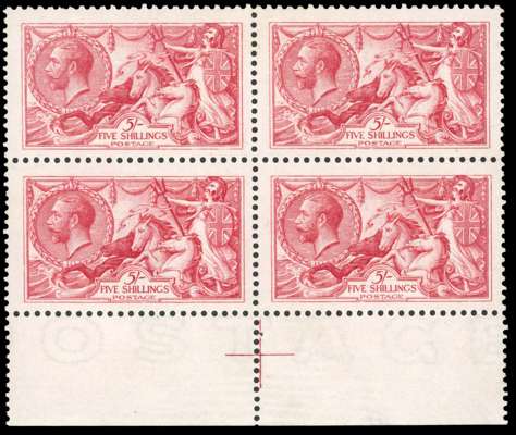 1913 5s rose-carmine lower marginal block of four, with sheet centre guide mark and trace of '(P)OSTAGE' watermark, mint large part o.g. with lower pair unmounted, missing perf at top, otherwise fine, an attractive positional multiple. SG 401 cat £3200+
