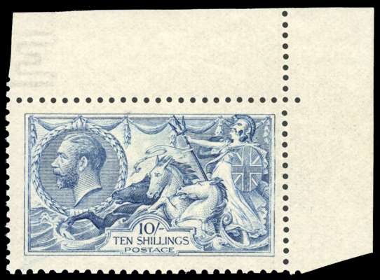 1915 DLR 10s pale blue, upper right corner marginal example, mint, unmounted o.g., (mounted in margin only). Fine and scarce. SG 413, Spec. N70(4), £3,500.